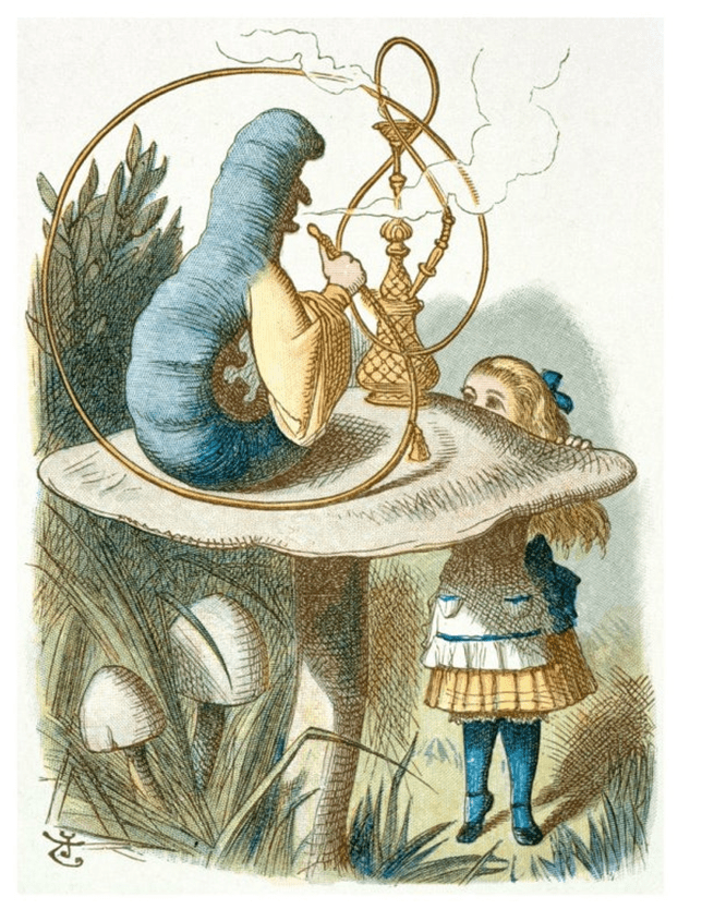 Alice ends up in Wonderland, because her burning curiosity leads her down a rabbit hole and into some bizarre encounters with unexpected characters. One of which, is with a hookah-smoking Caterpillar, sitting on a mushroom, who asks Alice the central question of her journey, ‘who are you?’