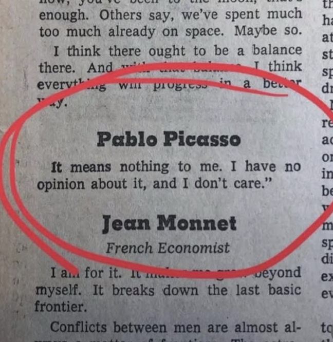 The New York Times ran some interviews, asking famous people to comment on this milestone in history. One of those was the renowned artist Pablo Picasso, who reportedly responded to the moon landing with a shrug, saying: